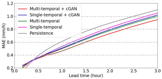 The MAE scores at 0–3 h lead times are shown in Figure 8. While the evaluation results for very short lead times within 20 min could be affected by the optical flow model’s overestimation of motion fields for heavy precipitation in the Korean Peninsula, as shown in Figure 6, we confirmed that the impact of motion fields becomes more significant in terms of accuracy and the evolution of the precipitation field with longer lead times of 0.5 to 3 h. Hence, the models including the optical flow method generally outperformed the Persistence model. As illustrated by the qualitative analysis presented in Figure 5, it is evident that the inclusion of the multi-temporal optical flow field significantly contributes to the accuracy of predicting precipitation field locations. The MAE values obtained from models incorporating the multi-temporal optical flow fields are notably lower than those obtained from models lacking such fields. Furthermore, the multi-temporal model with cGAN exhibits lower MAE values compared to the multi-temporal model without cGAN, demonstrating that the model with cGAN provides more accurate predictions of rainfall intensities.