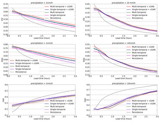 We compared the nowcasting outputs obtained by three different models. An example of precipitation nowcasting at 1–3 h lead time is displayed in Figure 5. In the case of the models without multi-temporal optical flow field, the precipitation motions mainly occurred from west to east, which is inconsistent with the ground truth results. By considering the multi-temporal optical flow field, the motion toward the southern area was captured, as shown in the middle panels, up to 3 h lead time. We point out that, although the inclusion of cGAN can capture the temporal changes in rainfall intensity, tracking the multi-temporal optical flow field is of greater importance in predicting the nonlinear evolution of the precipitation field.
