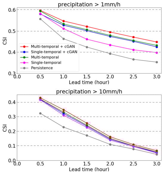 Compared with the convolutional models listed above, generative models have attracted attention as a technology for precipitation nowcasting [,,]. The generative model produces images or videos based on the distribution of the training image/video dataset. Generative adversarial networks (GAN) [] have been extensively implemented in various models for efficient training. The GAN simultaneously trains the generator and discriminator. The generator produces images from random input noise, and the images produced by a well-trained generator show distributions similar to real images. The discriminator learns to classify the fake (i.e., images produced by the generator) and real images. Through competitive training of the generator and discriminator, the generator can make the output images indistinguishable from real images. Generative models, such as conditional GAN (cGAN), use additional conditions (e.g., input data of the generator) for training and can generate targeted outputs that suit specific conditions []. Generative models based on cGAN, such as deep generative model of radar (DGMR), have been proposed, and these models have the benefit of reducing the blurry effect compared with convolutional neural networks [,]. However, the prediction accuracy based on the critical success index (CSI) is poor, particularly when predicting strong rainfall events (), and the predicting time is limited so far up to 1.5 h lead time, which is much shorter than the timescale required for operational precipitation nowcasting. Indeed, according to surveys across Europe, for instance, the preferred lead time to start with preparatory measures is 3–6 h lead times [,]. Hence, it is unlikely to adopt the currently proposed model for operational precipitation nowcasting.
