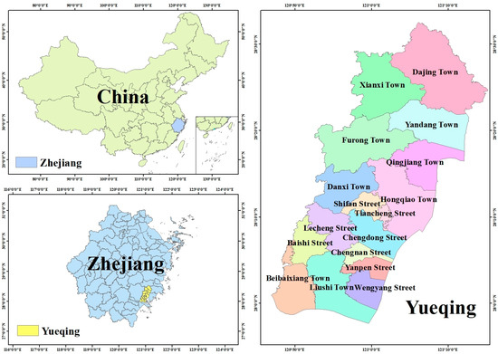 As shown in Figure 1, Yueqing City is located on the southeast coast of Zhejiang Province, on the north bank of the Oujiang Estuary, connected to Yandang Mountain in the northwest and Haiping Plain in the southeast. The city’s land area is 1391 km2, and its sea area is 284.3 km2. Yueqing Bay is located at 27°5′–28°23′ north latitude and 120°57′–121°16′ east longitude.
