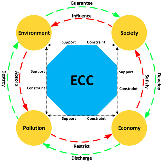 China’s coastal areas make full use of its unique geographical location, convenient transportation, and open policies to communicate with the world and become an important window for China’s opening up [1]. In recent decades, the acceleration of urbanization and industrialization in coastal areas has caused the destruction of the ecological environment and seriously affected the coastal ecosystem [2]. The coastal zone is a special zone of ocean–sea–land–air interaction, characterized by complex interface processes, rich natural resources, and a fragile ecological environment [3]. The stability of this region is poor, and once damaged, it will cause a series of environmental problems, bring great pressure to the local environment, even destroy the ecological balance, and limit sustainable development [4]. In order to quantify the impact of human activities on the environment and seek the harmonious coexistence of man and nature, environmental carrying capacity (ECC) has attracted the attention of scholars [5]. ECC has an important impact on social and economic development, and scientific evaluation of ECC has important scientific and practical significance for ensuring sustainable development of coastal areas [6].