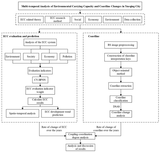 With the rapid development of coastal cities, environmental problems are becoming increasingly severe. Therefore, it is imminent to assess the environmental carrying capacity (ECC) of coastal cities. We take Yueqing City, China, as the study area and establish an ECC evaluation system. For the objectivity and scientificity of this study, the coefficient of variation-back propagation neural network (CV-BPNN) method is used to determine the weight of the indicators and a multi-temporal evaluation is conducted. This paper also explores the relationship between coastline changes and ECC variations for the first time. The results indicate: (1) The ECC of Yueqing City first decreased and then increased, and the inland ECC is better than the coastal area. The future trend is expected to rise. (2) The coastline is continuously extending seaward, and the natural coastline retention rate gradually declines. (3) The coupling coordination degree between the change in the ECC and the change in the coastline shows a trend of “first fluctuation, then stability, and then decline,” and the ecological environment situation was still challenging. (4) Based on the above results, some suggestions are put forward to strengthen coastal ecological development and promote the sustainable development of coastal cities.