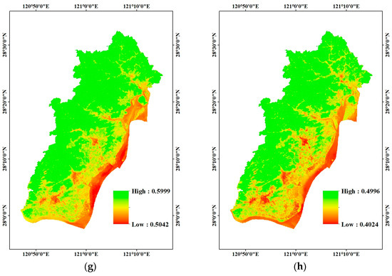 Figure 7 shows the ECC evaluation results of Yueqing City from 2006 to 2020. The spatial distribution characteristics of ECC have remained similar over the years. Influenced by the terrain, the northwest part of Yueqing City is primarily mountainous, characterized by a good ecological environment, abundant natural resources, lower population density, and limited commercial and agricultural activities, resulting in generally higher scores in ecological environment assessments. Yueqing City’s terrain slopes from northwest to southeast, and the southeastern coastal areas mostly consist of plains adjacent to Yueqing Bay. It is characterized by higher population density and higher economic and development levels compared to the inland areas. With the rapid development of Yueqing City, this region’s ecological environment and natural resources are facing greater pressure, leading to lower ECC scores in the southeastern region.