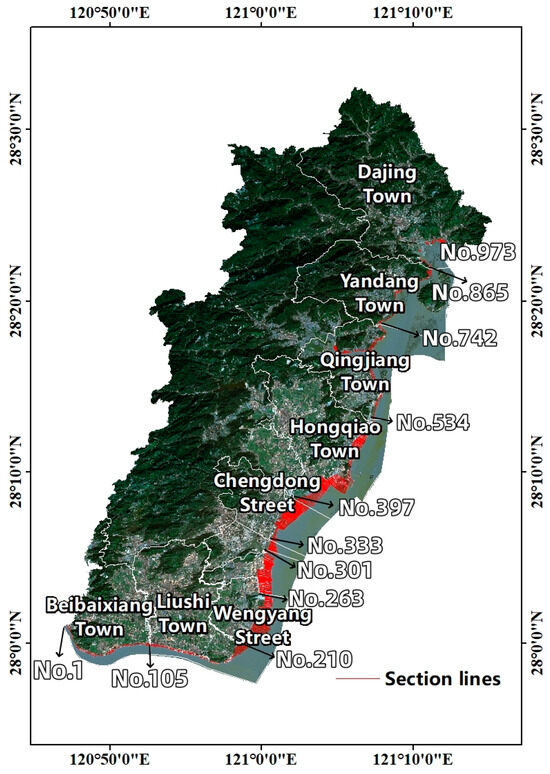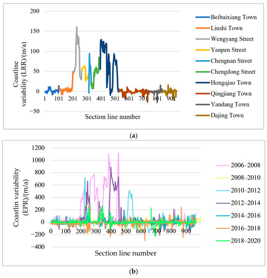 In this study, there are 973 section lines generated based on the DSAS system. The overall distribution of the section lines is shown by the blue markings in Figure 13. According to Figure 14a, it can be observed that the coastline changes of Yueqing City presented an unstable state over the past 15 years, in which the coastlines of Wengyang Street, Yanpeng Street, Chengnan Street, Chengdong Street, and Hongqiao Town have obvious changes, among which the coastline change rate (LRR) around the intersection of No. 230 (Wengyang Street) is as high as 160 m/a. The coastline change rate (LRR) around the intersection of No. 420 (Hongqiao Town) exceeds 100 m/a, and the average coastline change rate around Yanpan Street and Chengnan Street is 50 m/a. The peak value of the coastline change rate in these areas is mainly due to land reclamation, port construction, wharf construction, etc. The detailed analysis is as follows.