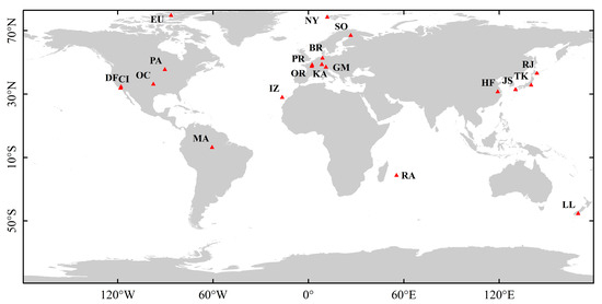 The TCCON network employs ground-based Fourier Transform Spectrometers (FTS) to capture solar spectra in the near-infrared spectral region. This produces a long time-series of highly accurate, column-averaged measurements of various gases including CO2, CH4, N2O, HF, CO, H2O, and HDO [50]. Currently, there are a total of 31 ground stations used for data collection, of which approximately 27 are in operation, mainly located in the United States and Europe. TCCON observation stations are typically set up in areas within a 100 km range that is less impacted by human activities, and unified standards are used for long-term continuous monitoring of atmospheric composition. The XCO2 data published by different TCCON sites are consistent, since TCCON observations are processed using the same standard processing program. In fact, the observation of CO2 from TCCON’s FTS can achieve an accuracy of 0.25% under clear skies or very light cloudy conditions [50]. TCCON data were obtained from the TCCON Data Archive (http://TCCON.ornl.gov, accessed on 1 May 2023.), which is hosted by the CO2 Information Analysis Center. This study used the latest version of the TCCON dataset (GGG 2020). Due to considerations of spatial and temporal resolution, a total of 20 TCCON sites were carefully selected (Figure 1; Table 2).