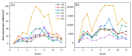 Monthly variations in data amount across seven continents for (a) GOSAT retrievals, and (b) OCO-2 retrievals in 2015, with AS representing Asia, NA representing North America, EU representing Europe, AF representing Africa, SA representing South America, and OA representing Oceania.