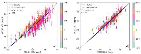 Scatter plot of the collocations of (a) TCCON and GOSAT XCO2 and (b) TCCON and OCO-2 XCO2 using the ±110 km and ±30 min coincidence criteria. The colors in both panels represent the latitudes of the TCCON sites. The dotted line represents the one-to-one line, and the blue solid line represents the OLR, with the corresponding regression formula shown in the figure. ρ represents the correlation coefficient of the matched data pairs.