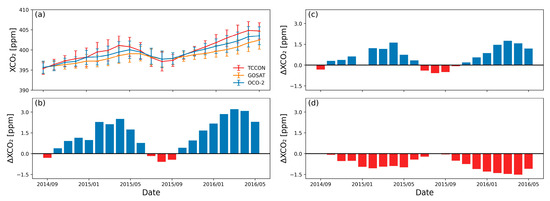Figure 5d shows the monthly mean XCO2 difference statistics between the GOSAT and OCO-2 XCO2 (i.e., XCO2 GOSAT − XCO2 OCO−2) from September 2014 to May 2016. The mean bias ± standard deviation of differences is 0.92 ± 1.16 ppm. Overall, the difference between the GOSAT and OCO-2 was the smallest at 0.08 ppm in October 2014, and the largest at approximately 1.51 ppm in April 2016. Figure 5d indicates that there is no apparent time-dependent change in differences, and similar conclusions can be seen in previous studies [30].