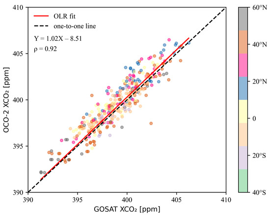 Scatter plot of the collocations of GOSAT and OCO-2 XCO2 using the ±10.5 km and ±1 h coincidence criteria. The colors represent the latitudes of the satellite sites. The dotted line represents the one-to-one line, and the red solid line represents the orthogonal linear regression (OLR) fit, with the corresponding regression formula shown in the figure. The matched data pairs have a correlation coefficient of ρ.