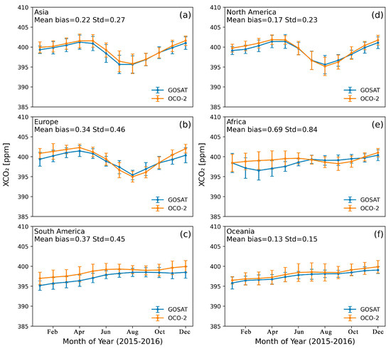The GOSAT and OCO-2 were well-consistent in Asia and Oceania, with mean biases and standard deviations of 0.22 ± 0.27 and 0.13 ± 0.15, respectively (Figure 7a,f and Figure 8). To expand on the reasons behind the higher differences in the XCO2 values observed in Asia during May, June, and July (Figure 7a), it is worth noting that the humid climate during this period can significantly impact the accuracy and precision of CO2 column-concentration measurements obtained by the GOSAT and OCO-2 satellites. Clouds and aerosols can greatly affect the accuracy of observations [76]. Additionally, the terrestrial ecosystem in Asia plays a stronger role during these months, contributing to the higher observed differences in XCO2 values. The combined effects of humidity and the role of the ecosystem can lead to an increased variability in measurements, making it challenging to obtain accurate data during this period.