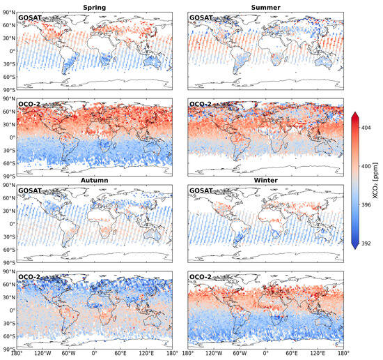 Spatial Distribution of XCO2 in different seasons as observed by GOSAT and OCO-2 for the year 2015; spring refers to March–May, summer to June–August, autumn to September–November, and winter to December–February.