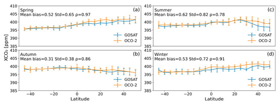 During spring, the XCO2 correlation between the GOSAT and OCO-2 was highly consistent, with a correlation coefficient of 0.97 (Figure 10a). The latitudinal gradient indicated that XCO2 was lower in the Southern Hemisphere than in the corresponding latitudes in the Northern Hemisphere. This could be attributed to plants entering a recovery phase, during which respiration is higher than photosynthesis, leading to an increase in the atmospheric CO2 concentration [84]. The maximum deviation occurs in the latitude range from 10 to 30°N, with an average error of 1.54 ppm.