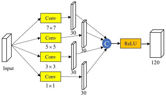 Regarding fringes and deadline noise, multi-resolution convolutional blocks were introduced to extract the multi-resolution features of contextual information, which can be used to obtain better information about objects and the surrounding environment. The receptive field of the network represents the size of the local area on the input image that will be mapped to depth features. Local features with small receptive fields contain more detailed information, and global features with large receptive fields can provide important contextual information for heavy noise removal, according to the non-local self-similarity (NSS) [28]. As shown in Figure 2, four convolution kernel sizes (, , , and ) were applied to the spatial data, spatial gradients, and spectral gradients to obtain feature maps for 30 channels. For image recovery tasks, the input and output sizes must be consistent. Under the premise that the stride length is fixed at 1, in order to keep the output size the same size as the input size after convolution, the convolution operation corresponds to different fill values for convolution kernels of different resolutions. For convolution kernels of , , and , the fill sizes are 1, 2, and 3, respectively. Various activation functions can be used in the non-linear activation layer, such as the tanh, sigmoid, and rectified linear unit (ReLU) functions. The ReLU activation function was chosen for this study considering the learning speed.