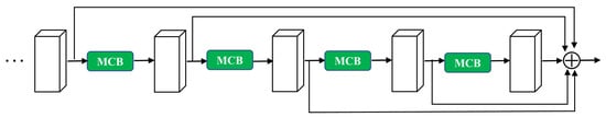 In this study, a fully cascaded multi-resolution convolution was used. The input features of each MCB were obtained by cascading the output features of all previous MCBs. Neural networks can usually take advantage of high nonlinearity to obtain more basic feature extraction and expression capabilities, and different feature information is present at different levels of depth. To effectively use the features between the indirect connection layers instead of direct attenuation, residual connections were used to concatenate the multiple feature maps from different convolutional layers, as shown in Figure 3. Residual connections can effectively reduce the degradation problem of traditional deep networks, so that we could add more training layers to the network and increase network performance.