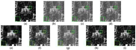 Denoising results in case 3: (a) Original image with band 45; (b) noisy image; (c) LRTA; (d) BM4D; (e) LRTV; (f) LRMR; (g) NAILRMA; (h) SSGN; and (i) our method.