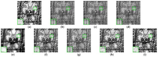 Denoising results in case 5.1: (a) Original image with band 59; (b) noisy image; (c) LRTA; (d) BM4D; (e) LRTV; (f) LRMR; (g) NAILRMA; (h) SSGN; and (i) our method.