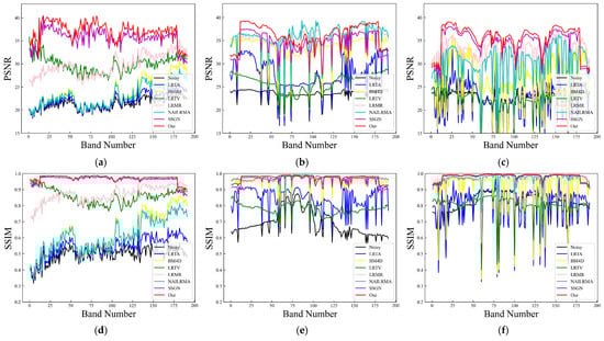 Comparison of indicators for each band with different denoising methods in cases 3, 4, and 5.1: PSNR (a–c) and SSIM (d–f).