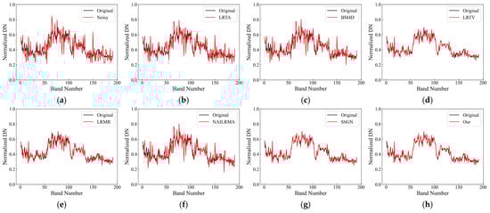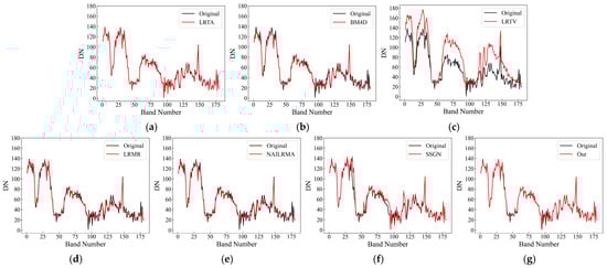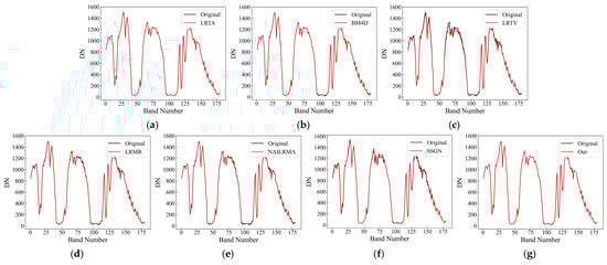 Comparison of spectral curves before and after denoising the bright-area cell (208, 104). (a) LRTA; (b) BM4D; (c) LRTV; (d) LRMR; (e) NAILRMA; (f) SSGN; and (g) our method.