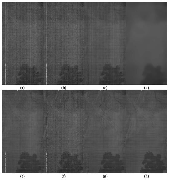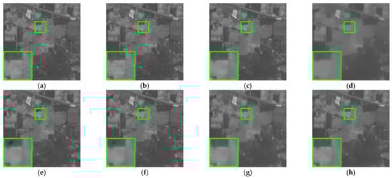 Denoising results for the atmospheric absorption band of the GF-5 HSI: (a) Original image with band 42; (b) LRTA; (c) BM4D; (d) LRTV; (e) LRMR; (f) NAILRMA; (g) SSGN; and (h) our method.