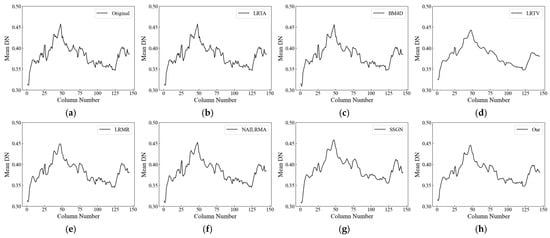 Column mean DN value for band 3 in the AVIRIS Indian Pines data set: (a) Original image with band 3; (b) LRTA; (c) BM4D; (d) LRTV; (e) LRMR; (f) NAILRMA; (g) SSGN; and (h) our method.