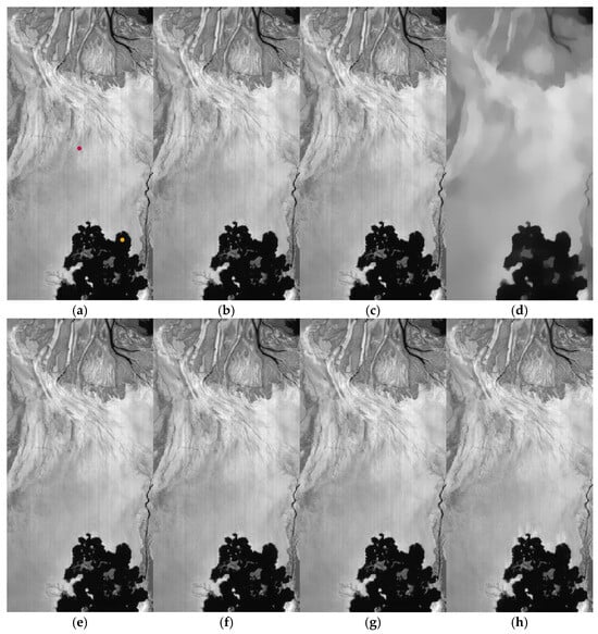 Denoising results for the non-atmospheric absorption band of the GF-5 HSI: (a) Original image with band 61; (b) LRTA; (c) BM4D; (d) LRTV; (e) LRMR; (f) NAILRMA; (g) SSGN; and (h) our method. The red dot in (a) is a point picked from the bright area, and the yellow dot is a point from the dark area.