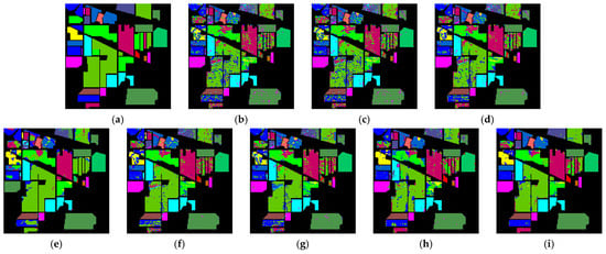 HSI classification results for Indian Pines. (a) Ground truth; (b) noisy; (c) LRTA; (d) BM4D; (e) LRTV; (f) LRMR; (g) NAILRMA; (h) SSGN; and (i) our method.