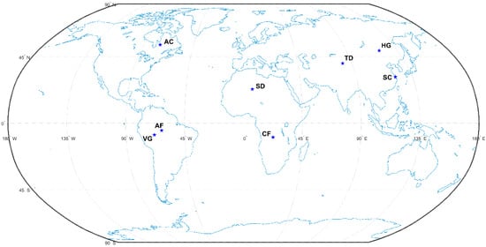 Geographical locations of eight datasets in this study: CF, woodland in the Congo region; AF, forest in the Brazilian Amazon; SD, Sahara Desert; TD, Taklamakan Desert, China; HG, steppe in Inner Mongolia, China; VG, steppe in Venezuela; SC, Shanghai, China; AC, Atlantic coastal urban agglomeration, northeast USA.