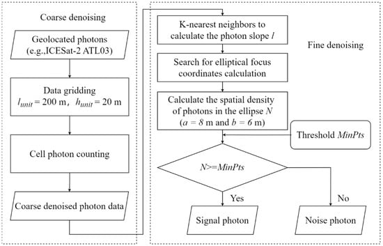 According to the characteristics of uneven distribution of ICESat-2 photon-counting data, we propose a multi-stage adaptive noise-filtering algorithm called MLANF. The algorithm follows a two-step process: coarse denoising and fine denoising. The purpose of the coarse denoising step is mainly to detect the potential signal photon regions. The purpose of the fine denoising step is to optimize the density clustering through the adaptive denoising algorithm. The detailed steps of the MLANF algorithm are shown in Figure 3. The geolocated photons are gridded, and the regions with potentially more signal photons are selected according to the grid density. Then, the circular search area is modified to be elliptical. The direction of the central axis of the search area is automatically changed along the terrain’s slope so that the density clustering results are more closely matched to the signal photon data area.