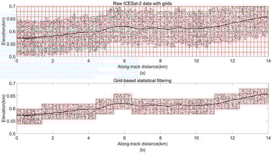 The raw geolocated photons data can be regarded as 2-dimensional data with an along-track distance in the x-axis direction and elevation in the y-axis direction. By observing the geolocated photons of ATL03 products datasets (Figure 2), the signal photons are uniformly distributed in the x-axis direction and concentrated in the y-axis direction at the middle height position in the overall photon data. Most of these signal photons are soil or vegetation surfaces with high density. In contrast, the noise photons are uniformly distributed along the upper and lower sides of the signal photon. In general, the space occupied by noise photons is larger than that occupied by signal photons, but the density is lower than that of signal photons. According to the above signal and noise photon characteristics, we use a gridding process for the raw photons, e.g., column by column and row by row []. Then, the potential signal photon regions are detected according to the number of grid photon points. The specific steps are as follows: