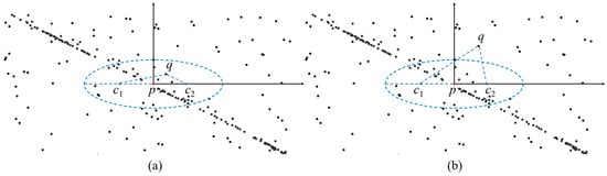 When the horizontal ellipse model is used instead of the circular search region, the key parameters of the horizontal ellipse model are changed from the radius e to the long semi-axis a and the short semi-axis b. In this paper, we still use the Euclidean distance to determine whether a point q is located in the elliptical search region with the core point p as the center. If the distance from the point q to the two focal points c1 and c2 of the ellipse is less than the length of the long axis of the ellipse 2a, the point q is in the search ellipse of the point p, as shown in Figure 6. The distance d from point q to the two foci of the ellipse with core point p as the center is calculated by Equation (3):