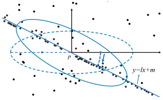 where l and m are the slope and intercept of the fitted linear, respectively. We consider the direction of the slope of the line as the direction of the long axis of the ellipse model. If the line equation of the surface photons after the least squares fitting is , the two focal points c1 and c2 of the ellipse will be as shown in Equations (7) and (8):
