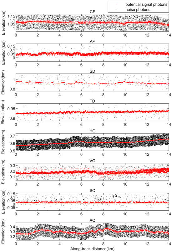 We use coarse denoising to the raw photon data in eight study regions separately. To better obtain coarse denoising results, we tune the grid size to each region based on the size of 200 m × 20 m. Figure 8 shows the results of eight study areas. The red dot set represents the signal photons after coarse denoising, and the black dot set represents the filtered noise photons.