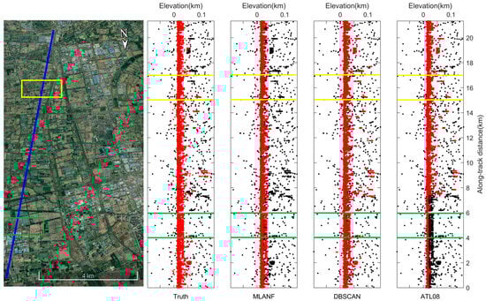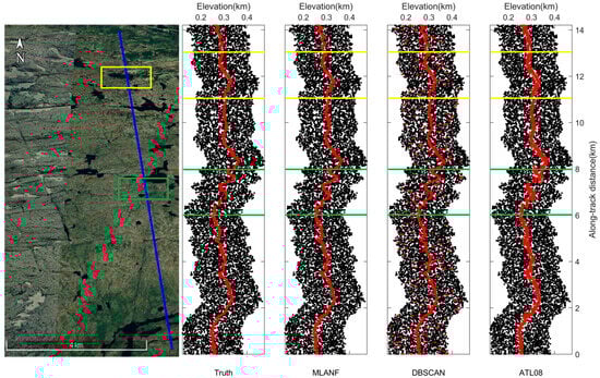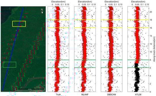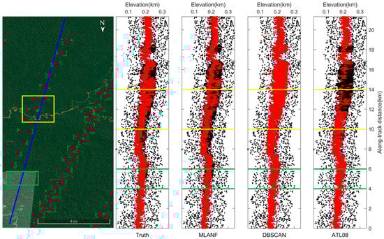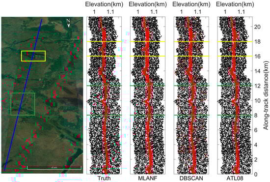 The denoising results of the geolocated photons of the Amazon Forest are shown in Figure 11. The overall track length of this section is about 20 km, and the elevation variation range is more noticeable than that of the Congo Forest. We find that the area is mainly covered with tall forest vegetation. As these photon data are from the gt1r track, the overall photon data have less random noise. The MLANF algorithm and the DBSCAN algorithm have better denoising effects. The ATL08 data have some missing signal data at 0~7 km, and the signal photon extraction result in the latter half is close to the truth value. Figure 12 shows the detailed results of 6~8 km (green interval) and 16~18 km (yellow interval) in this region. At 6~8 km, the result of our method is closer to the truth value than the other two algorithms. The DBSCAN algorithm misclassifies some signal photons as noise photons, and the result of ATL08 misses some signal photon data. At 16~18 km, the result of ATL08 is more similar to the truth. MLANF and the DBSCAN algorithm have a few signal photon extraction errors.