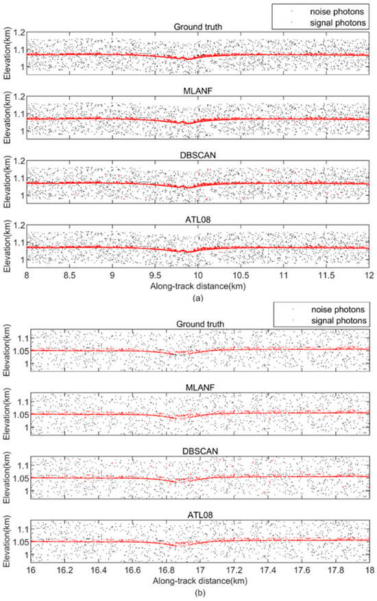 Comparison of detailed results of different signal photon extraction methods in the Amazon Forest study area. (a) Enlargement of the along-track segment corresponding to the green box in Figure 11 at the along-track distance from 6 to 8 km. (b) Corresponding to the yellow box in Figure 11, the along-track distance increases from 16 to 18 km.