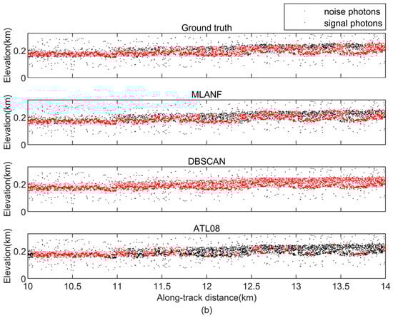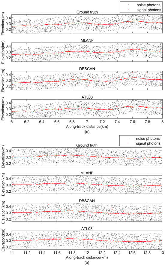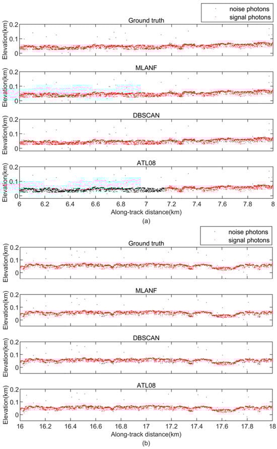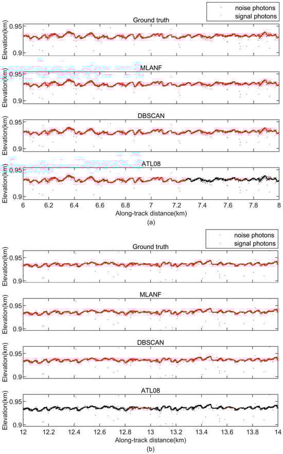 Comparison of detailed results of different signal photon extraction methods for the study area of the northeast Atlantic coastal urban group, USA. (a) Along-track segment corresponding to the green box in Figure 23 is enlarged at along-track distances from 6 to 8 km. (b) Corresponding to the yellow box in Figure 23, the along-track distance increases from 11 to 13 km.