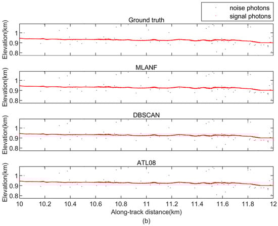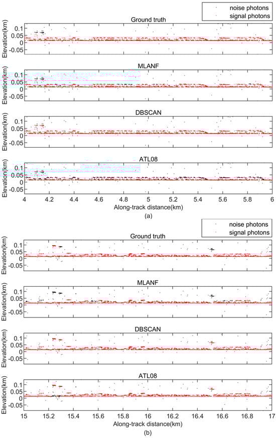Detailed results of the comparison of different signal photon extraction methods in the Shanghai study area. (a) Along-track segment corresponding to the green box in Figure 21 is enlarged at the along-track distance from 4 to 6 km. (b) Corresponding to the yellow box in Figure 21, the along-track distance increases from 15 to 17 km.