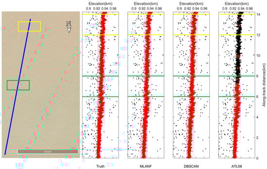 Figure 15 shows the denoising results of the TD dataset. This area has many ravines and no vegetation. Like the Sahara Desert data, the signal photons are distributed with less random noise. Three algorithms detect signal photons accurately. The DBSCAN and MLANF algorithms can obtain an excellent denoising effect. But some regions in the ATL08 data are missing signal photons. We show the detailed results of 6~8 km (green interval) and 12~14 km (yellow interval) in Figure 16. The signal photons in this region fit the ground surface and represent the shape of undulating dunes. The signal photons are far away from the noise photons and are easy to distinguish.
