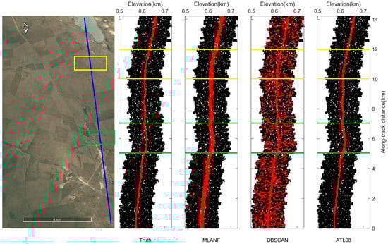 The overall denoising results of the raw photons of the Congo Forest are shown in Figure 9, where the corresponding Google Earth image with the photon track (the straight blue line in the image in Figure 9) is shown on the left. From the image data and the visually interpreted photon distribution, there is an undulating variation in the ground surface covering the grassland and forest vegetation in this approximately 20 km track. On the right side is the actual photon signal distribution of the visual inspection and the denoising results of the three methods.