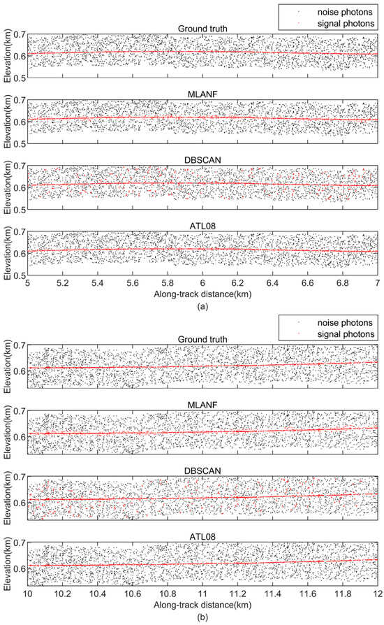 Comparison of detailed results of different signal photon extraction methods in the Congo Forest study area. (a) Enlarged along-track segment corresponding to the green box in Figure 9 at along-track distances from 8 to 12 km. (b) Corresponding to the yellow box in Figure 9, the along-track distance increases from 16 to 18 km.