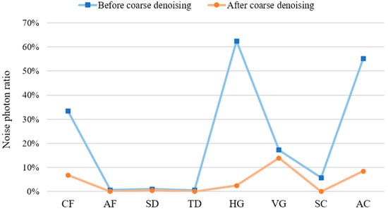 The noise photon ratio before and after coarse denoising in eight datasets.