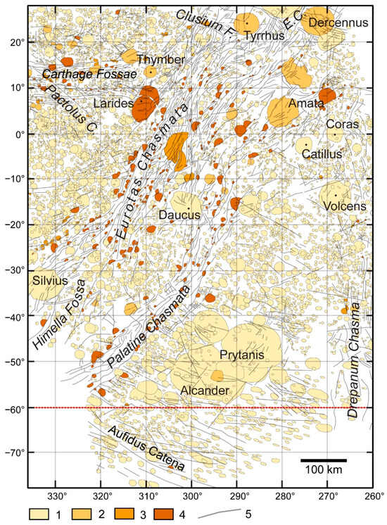 The primary geological map of the studied area of the Wispy Terrain focuses on polygonal and fragmented craters. The relationship between various tectonic features is based on the distribution of polygonal craters and crater fragments and the analysis of large crater wall “outcrops”. The marks with different numbers indicate 1—“normal”, non-tectonized craters; 2—Type P craters; 3—Type SSF craters; 4—Type TF craters; and 5—suspected tectonic movements. The dashed red line at latitude −60° indicates the region’s boundary, with mapping uncertainties southward due to the projection-related distortion of the surface features. For a detailed explanation, please see the text.