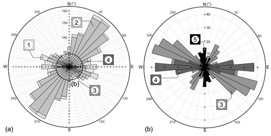 The strike of the linear features identified in the region (a) and a cut-out diagram with the ones with fewer linear features (b). The numbers indicate various linear feature groups belonging to different terrain units: 1—the whole studied location; 2—Eurotas and Palatine Chasmata (1222 linea); 3—the Prytanis–Alcander Plain (248 linea), a region eastward of Palatine Chasmata, named after two larger craters found there; 4—Carthage Fossae (139 linea); and 5—Drepanum Chasma (88 lines) (for more information about the referred terrain units, please see Figure 1b). The dotted circle shows the area of the cut-out diagram (b).