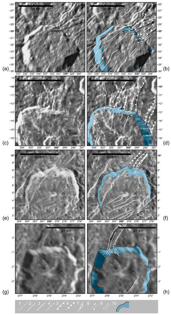 Structural geological characteristics observed in the walls of large craters crosscut by putative tectonic lines. (a,b) Silvius, (c,d) Daucus, (e,f) Amata, and (g,h) Catillus craters. The numbers in the legend represent the following features: 1—probable fault; 2—fault (uncertain direction of movement); 3—normal fault; 4—potential normal fault; 5—thrust fault; 6—probable thrust fault; 7—strike-slip fault with pull-apart basin; 8—orientation of (quasi-)vertical block movement; 9—direction of (quasi-)horizontal block movement; and 10—exposed crater wall. The figure is the modified version appeared in Bradák et al. [30], is reprinted/adapted with permission from Bradák et al. 2023 [30].