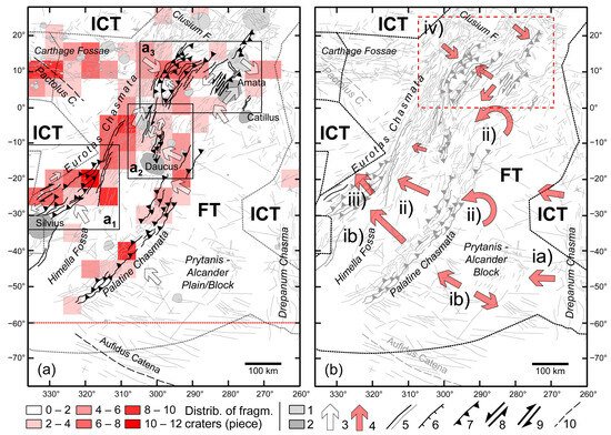 The relationship between various tectonic features is based on the distribution of various polygonal craters and crater fragments, the analysis of large crater wall “outcrops” (a), and the reconstruction of the tectonic development of the region (b). a1, a2, and a3 indicate locations with complex tectonic settings, characteristic of the studied part of the Wispy Terrain. The dotted lines represent the border between various terrains, named ICT (Intermediate Cratered Terrain) and FT (Faulted Terrain) [6]. The white-to-red gradual color background indicates the distribution of Type TF craters in the studied location, observed in a grid with a cell size of 50 km2. Dashed red lines at latitude −60° indicate the region’s boundary, with mapping uncertainties southward due to the projection-related distortion of the surface features. For a detailed explanation, please see the text. 1—Type P and SSF craters together; 2—craters with wall “outcrops” where tectonic features were studied; 3—indication of suspected tectonic movements; 4—reconstruction of main tectonic movements; 5—faults with uncertain direction of movements; 6—(probable) normal fault; 7—(potential) thrust fault; 8 and 9—orientation of quasi horizontal sinistral (left) and dextral (right) strike-slip fault movements, respectively; and 10—catenas. The marks (ia), (ib), (ii), (iii), and (iv) refer to the tectonic movements summarized in Section 5, shortly: (ia) extension triggered by the formation of Drepanum Chasmata; (ib) dilatation in Prytanis–Alcander block; (ii) closure of the area between Palatine and Eurotas Chasmata and the counterclockwise rotation of the Prytanis–Alcander block; (iii) putative subsumption between the Prytanis–Alcander Plain (block) and a block of Intermediate Cratered Terrain; and (iv) (the area inside the dashed red line) the renewal of some earlier tectonic lines of the Carthage and Clusium Fossae.