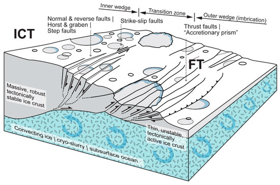 Model of a putative subduction-like (subsumption) setting on Dione, based on the tectonic features that appeared at the Wispy Terrain, observed at the Eurotas and Palatine Chasmata (Figure 6; a1 and 2). The reconstruction of various tectonic features is based on the schematic image of (mega-)splay fault system with wedge boundary strike-slip faults described and presented in Tsuji et al. [42]. The abbreviations ICT and FT refer to Intermediate Cratered Terrain and Faulted Terrain, respectively [6]. The figure is the modified version appeared in Bradák et al. [30], is reprinted/adapted with permission from Bradák et al. 2023 [30].