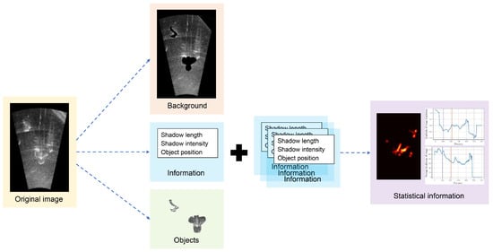During the object extraction process, the object’s center point is initially determined. This center point’s coordinates are then used to generate a heatmap for each object class, which is subsequently stored in the DataBank. Simply separating objects from the background overlooks shadows, which are essential properties of sonar images. To address this, we extract shadow information concurrently to restore these shadowed regions. Considering that shadows typically extend away from the sonar source, we initially transform the polar coordinate system used by the sonar into an orthogonal coordinate system. This transformation results in shadows appearing as square-shaped regions. To ensure that shadows are discernible in the noisy sonar images, we overlap all the shadows of the objects. Because the objects in the same class are all similar in shape and size, we incorporate information from the objects in order to more accurately estimate the shadows. We then define the shadow area to the point where the gradient is the largest, where the brightness value changes the most as the shadow ends. Because non-shadow areas can be included at this stage, only darker images are overlapped when comparing the previously obtained shadow area with the background to obtain the shadow area again. Using this refined shadow area, we compute various shadow characteristics, such as shadow length, shadow intensity, and the standard deviation of sonar noise. These shadow-related data are stored in the DataBank for further analysis. This process excludes the chain, valve, and wall classes, which have few shadows, and the shampoo-bottle and standing-bottle classes, which are already masked by shadows in the dataset.