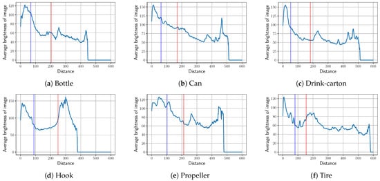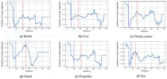 Gradient of average brightness of an image obtained by overlapping objects. The average point at which the object ends is indicated by the blue line, while the shadow’s estimated point is indicated by the red line.