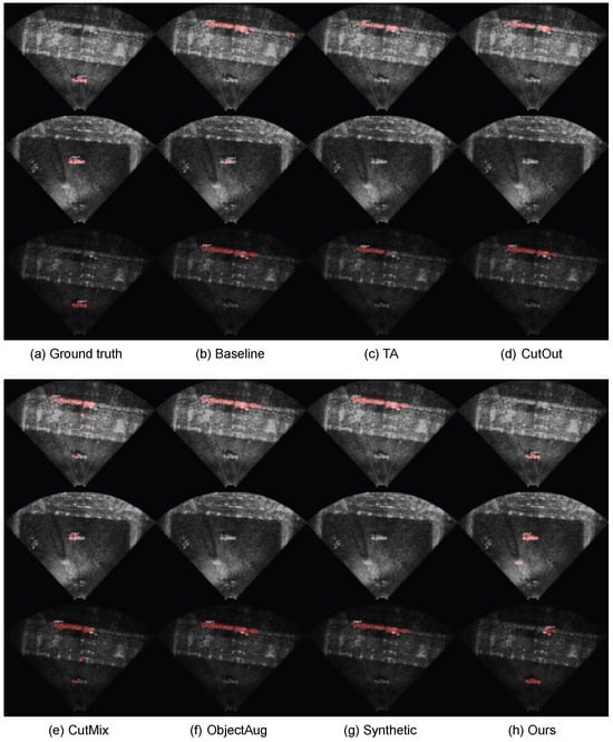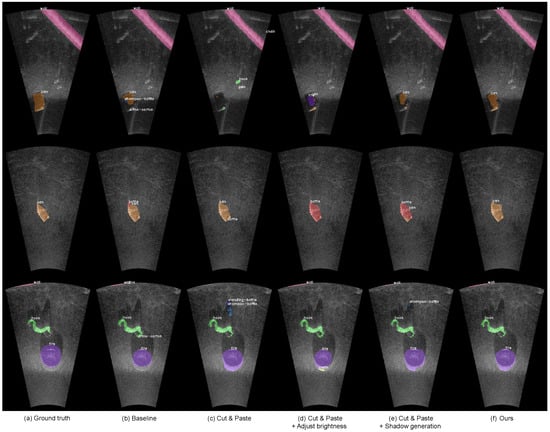 We additionally conducted an ablation study to assess the impact of our various data augmentation methods on the performance of the semantic segmentation model. As shown in Table 4, with the cut-and-paste method, mIoU performance was improved by 0.65%. This method simply cuts and pastes images, allowing the model to learn various object placement and background combinations. This diversity can improve the generalization capabilities of the model and improve performance. This suggests that a simple data augmentation method can improve the performance of the semantic segmentation model. When the cut-and-paste method and adjust brightness method were applied at the same time, mIoU performance was improved by 0.71%. This shows that adjusting objects to the brightness of the background can contribute to performance improvement when pasting them in various combinations. When the cut-and-paste method and shadow generation method were applied at the same time, mIoU performance was improved by 0.76%. This shows that augmenting data while maintaining the sonar’s characteristics through the shadow generation method contributes to the performance improvement of the model. When all of the above methods were applied, the model showed the greatest improvement of 1.10%. In summary, our ablation study highlights that cut-and-paste data augmentation strategies that make the most of our data by creating a DataBank with fewer data and methods that maintain sonar characteristics both play a major role in improving model performance. The segmentation results in the ablation study are shown in Figure 11.