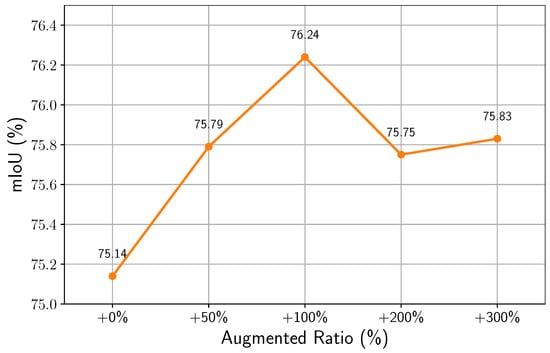 In this section, we examine the impact of varying the augmentation ratio on model performance. Experiments were conducted with different augmentation levels: 0%, 50%, 100%, 200%, and 300% relative to the size of the training dataset. As shown in Figure 12, we observed a relationship between the augmentation ratio and mIoU improvement. Without augmentation (+0%), the mIoU remained at 75.14%. With 50% augmentation (+50%), we observed an increase to 75.79%. The most significant improvement was achieved with 100% augmentation (+100%), resulting in an mIoU of 76.24%. However, it is noteworthy that increasing the augmentation ratio beyond 100% did not consistently lead to further improvements. At a 200% augmentation ratio (+200%), the mIoU decreased slightly to 75.75%. Even with a 300% augmentation ratio (+300%), the mIoU only reached 75.83%, which was marginally lower than the +100% augmentation. These results suggest an optimal balance in the augmentation ratio, with a 1:1 augmentation-to-training dataset size being the most effective. These results show that data augmentation in excess of this ratio can adversely affect performance, as the model is trained to fit only augmented data and is inconsistent on real data. In summary, our findings underscore the importance of carefully calibrating the augmentation ratio, emphasizing that a 1:1 ratio of augmentation to training dataset size is optimal for enhancing model performance in this specific context.