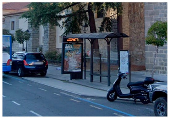The city of Ávila, located in Spain, is one of the European cities with the highest radiation intensity, with an average monthly value between 1583.50 and 1715.80 kJ/m2 [37]. With an area of approximately 230 km2, it is a city whose main means of urban transport is the bus. Currently, the urban transport network consists of a total of six urban bus lines with 74 bus shelters (Figure 1).